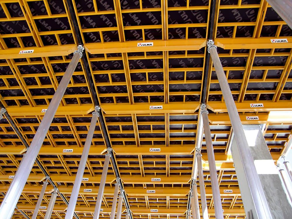 Ideal pour les dalles de bâtiment, surtout pour les grandes surfaces, avec géométrie et portées régulières entre poteaux et haute exigence de finitions. Composée de têtes CC, poutres, transversales TE et panneaux. Les panneaux composent la plus grande partie de la surface coffrante. Répercussion de 0,29 étais/m2 (dimension de la maille standard: 2,32 x 1,5m).
