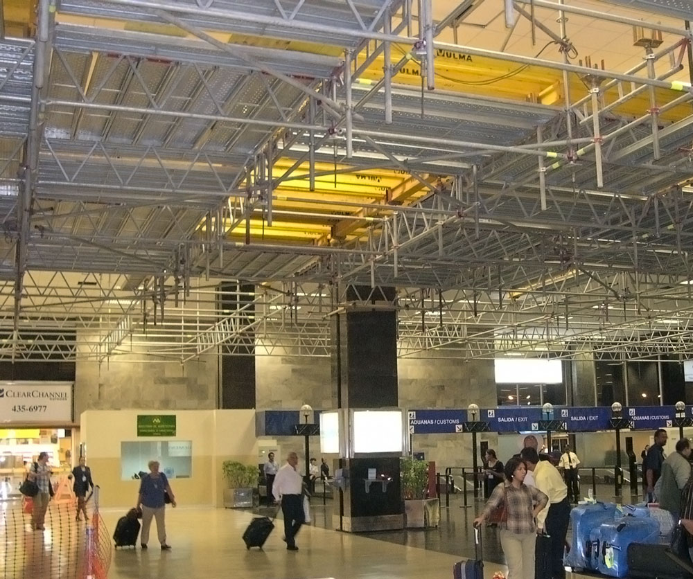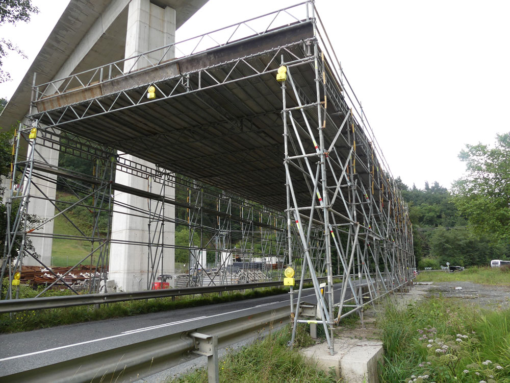 Lors de travaux sur des franchissements comme des passerelles, des ponts… Des structures provisoires de passage et de protection sont mises en œuvre afin de protéger les opérateurs et les piétons. La structure de protection se compose de tours d'échafaudages d’appuis, de franchissement en treillis et de la plate-forme de couverture et de protection.