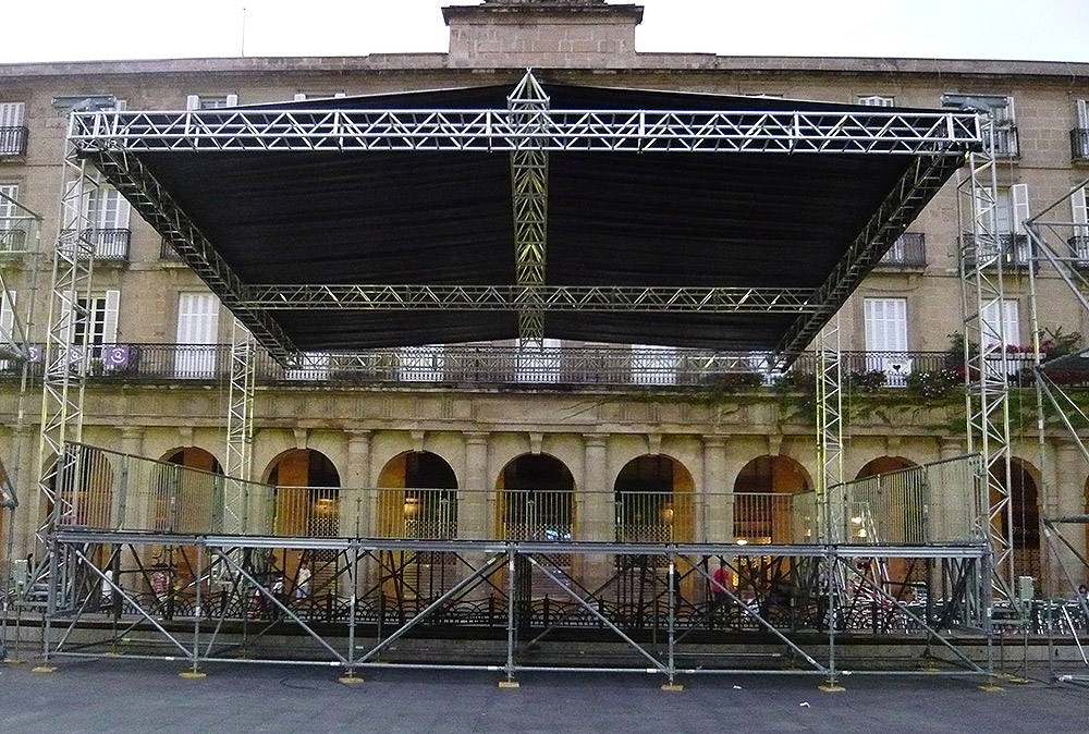 Après le montage de la scène, à hauteur variable, la mise en place des mats de levage est réalisée en toute sécurité grâce au système exclusif ULMA « BASCULO ». Ce système permet de construire une scène monobloc avec moins d’encombrement au sol. Tous les éléments de la couverture sont assemblés au sol en toute sécurité.