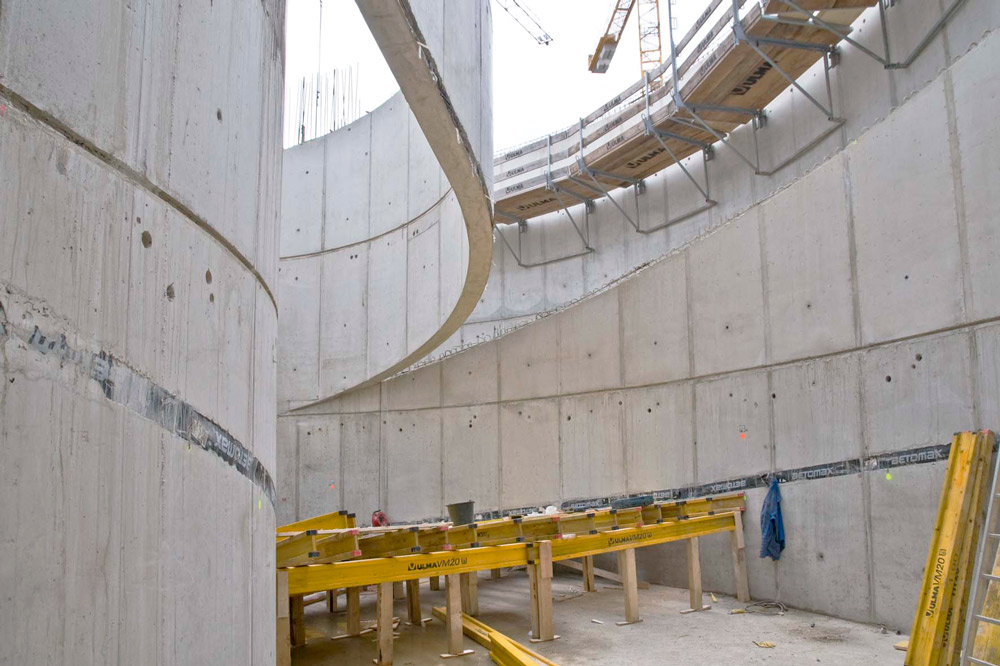 Plusieurs voiles nécessitaient une finition en béton apparent. Par exemple les voiles courbes, exécutés à l’aide de coffrages circulaires au rayon précis et ajustements sans effort.