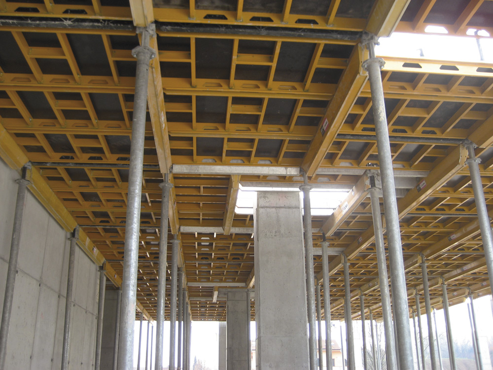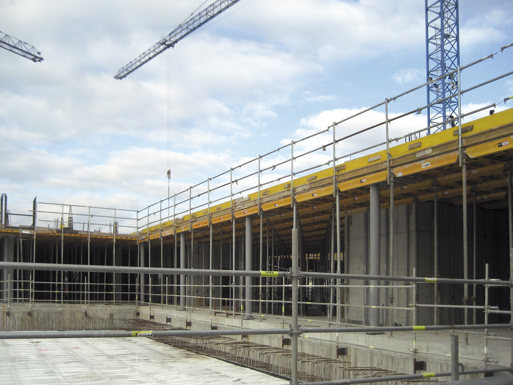 Le coffrage en aluminium CC-4 combiné à l’étai EP a représenté la solution idéale pour les grands étages sans interférences, avec un nombre minime de poteaux répartis régulièrement. Au total, et pour respecter les délais impartis, on a employé 8000 m2 de coffrage en aluminium CC-4 et 2300 étais EP. Ce système nécessite moins d’étais au m2 et permet de créer de larges espaces de travail et de réduire le temps de montage.