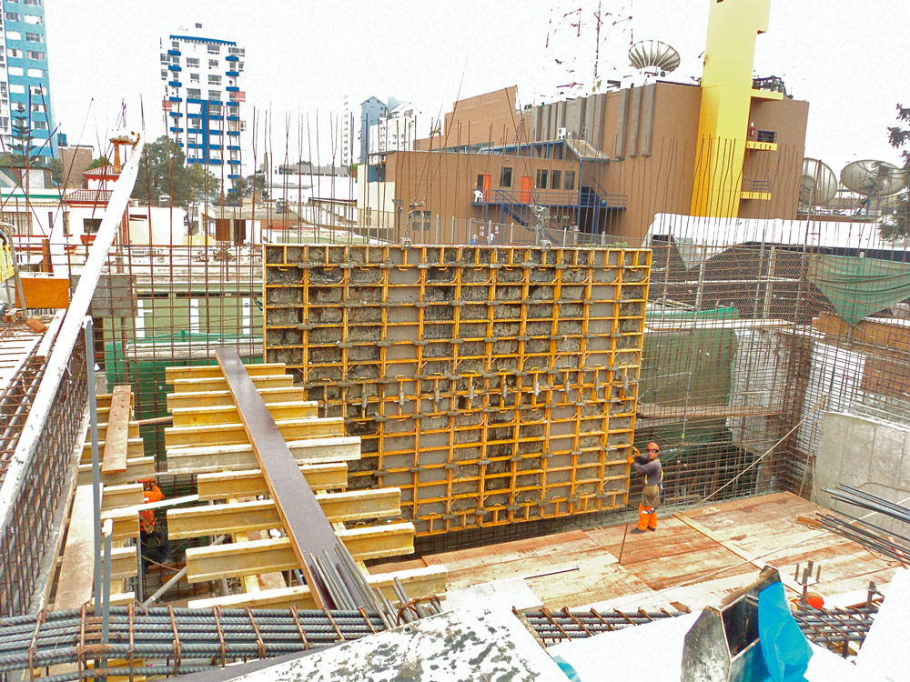 C’est le coffrage vertical NEVI qui a été choisi, facile à monter et fonctionnant avec peu d’éléments. De grands panneaux de 8 x 4 transportables à la grue ont été montés.