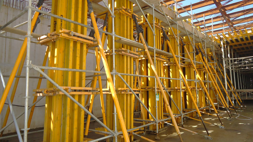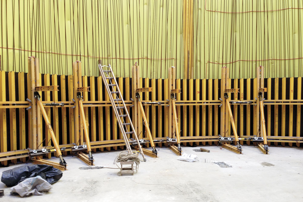 Les murs latéraux présentant une seule face de 5,7 m ont été réalisés à l’aide du coffrage ORMA et des fermes SMK, transférées en chariot d’un poste à un autre sans devoir être démontées.