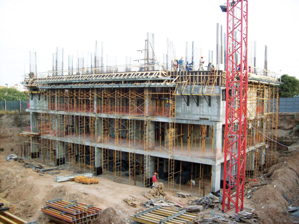 Les dalles, de 0,25 m d’épaisseur aux niveaux inférieurs et hauteurs libres supérieures à 4,5 m, ont été exécutées à l’aide du coffrage BTM étayé avec des étais SP et l’étaiement G. Les niveaux types, dont les hauteurs mesuraient 2,55 m ont été étayés avec les Etais ECO.