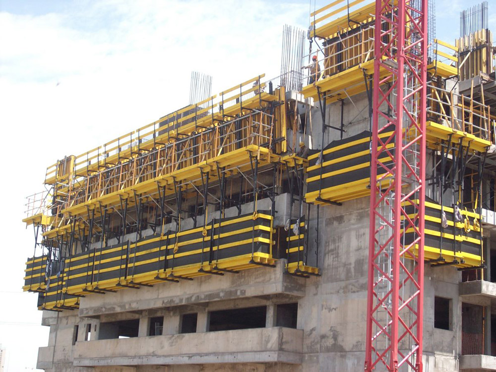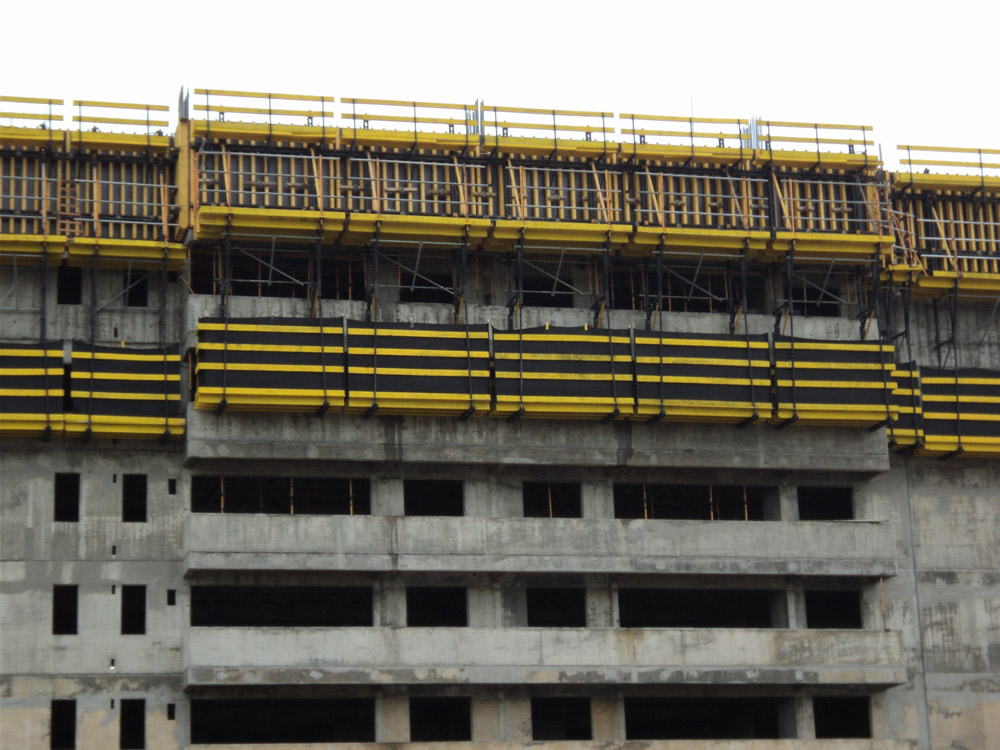 Pour le périmètre extérieur, on a utilisé la console support de banche CF-170. Pour garantir la sécurité des opérateurs, on a utilisé le plancher intérieur KSP pour les cages d’ascenseur et les escaliers.