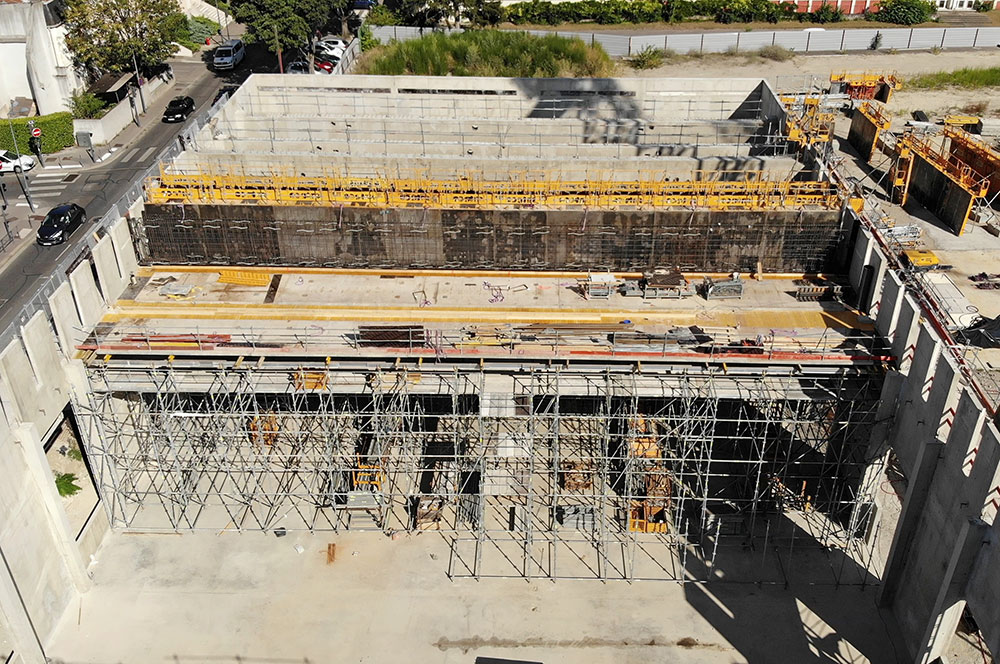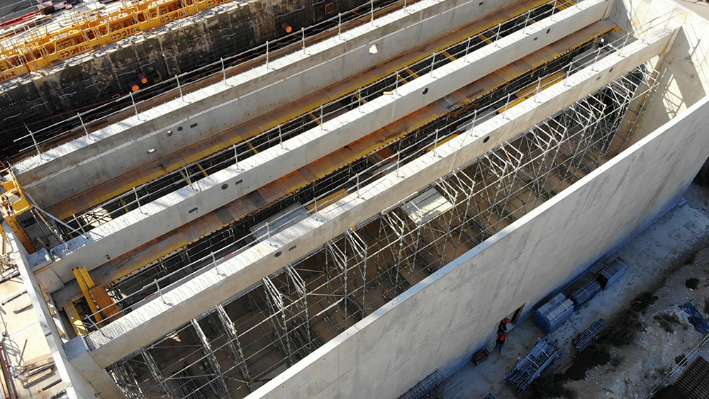 L'étaiement BRIO, totalement flexible et robuste a été choisi pour la réalisation des étaiements des mégas poutres de l'ouvrage. Rapide et sûr à monter BRIO a permis un montage à l'avancement du platelage coffrant des poutres. La flexibilité et la modularité de l'étaiement multidirectionnel ont offert un maillage optimal des structures avec un minimum de files de poteaux porteurs. Des plateaux coffrant disposés entre les axes des poutres et reposant sur les files latérales des étaiements ont diminués fortement le volume de matériel tout en permettant la mise en œuvre sécurisée des coffrages des joues de poutres.