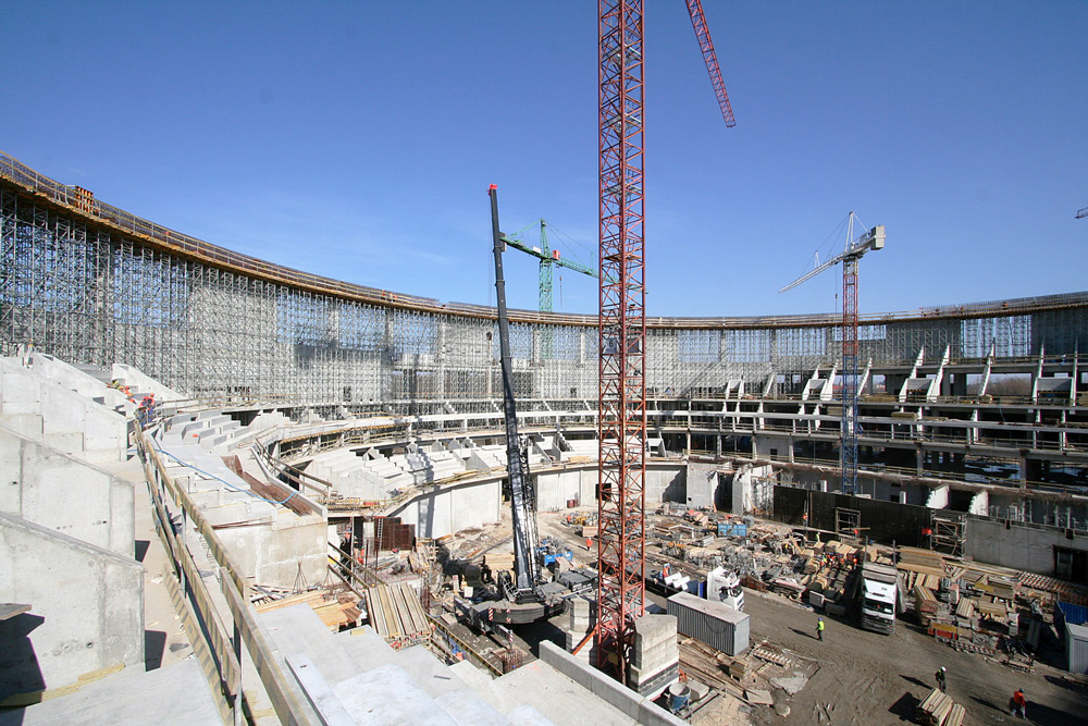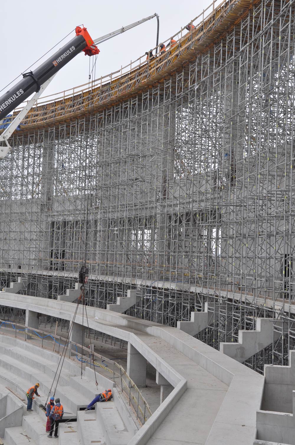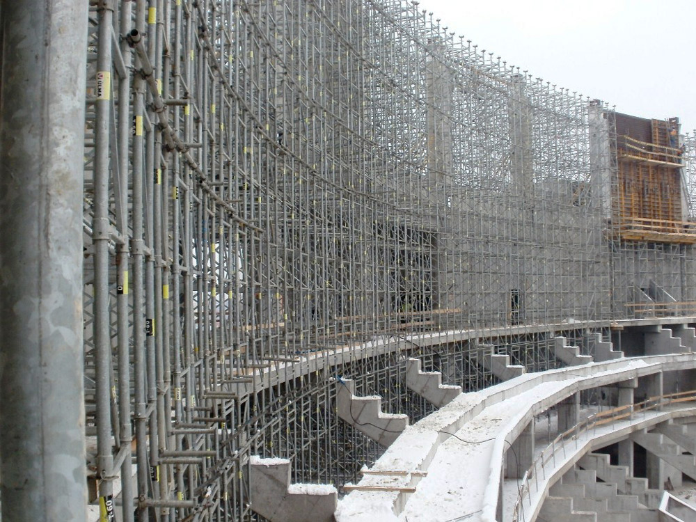 Par ailleurs, des échafaudages multidirectionnels BRIO ont été utilisés sur le site afin d’ériger des tours mobiles et d’effectuer ainsi les travaux d’installation de l’armature. Nous avons également utilisé les échafaudages BRIO pour la construction d’une grande plates-forme de travail de 70 mètres de long, sur une surface totale de 670 m² permettant l’installation des systèmes de chauffage et d’aération dans les tribunes à l’intérieur de la salle omnisports.