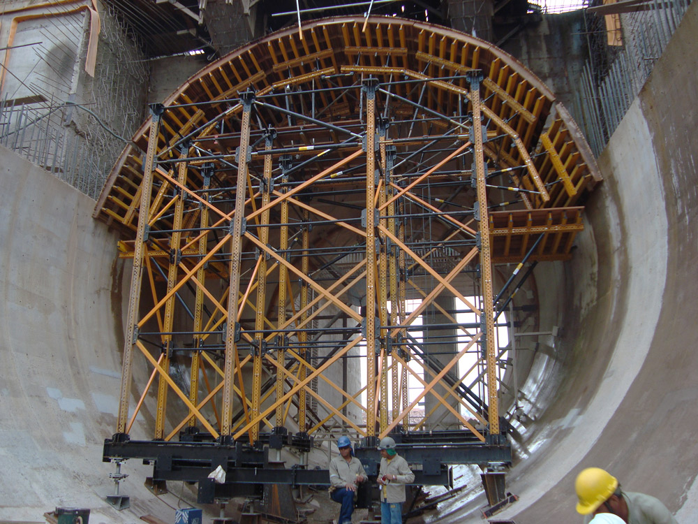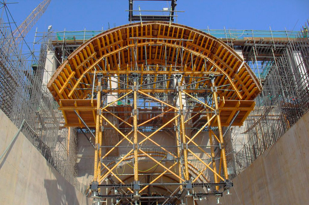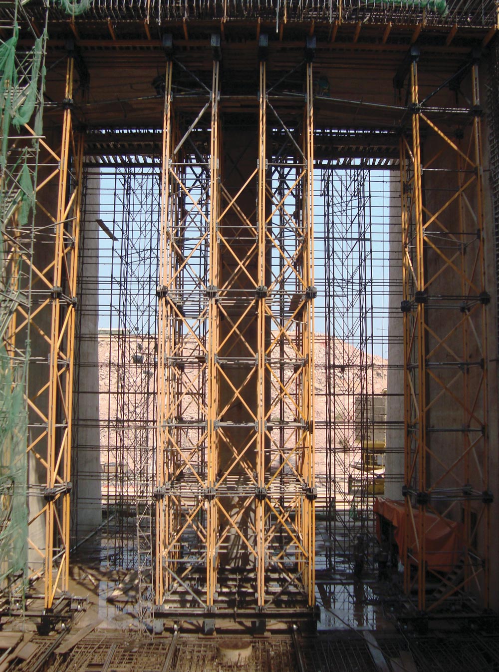 Au vu des dimensions des prises d’eau (18 m de haut et 2,5 m d’épaisseur), la solution adoptée a été deux tours mobiles MK-360 et les systèmes de coffrage ENKOFORM HMK et VMK. Le montage et le démontage ont été considérablement facilités grâce au système de roulement qui positionnait le portique d’une phase à l’autre.