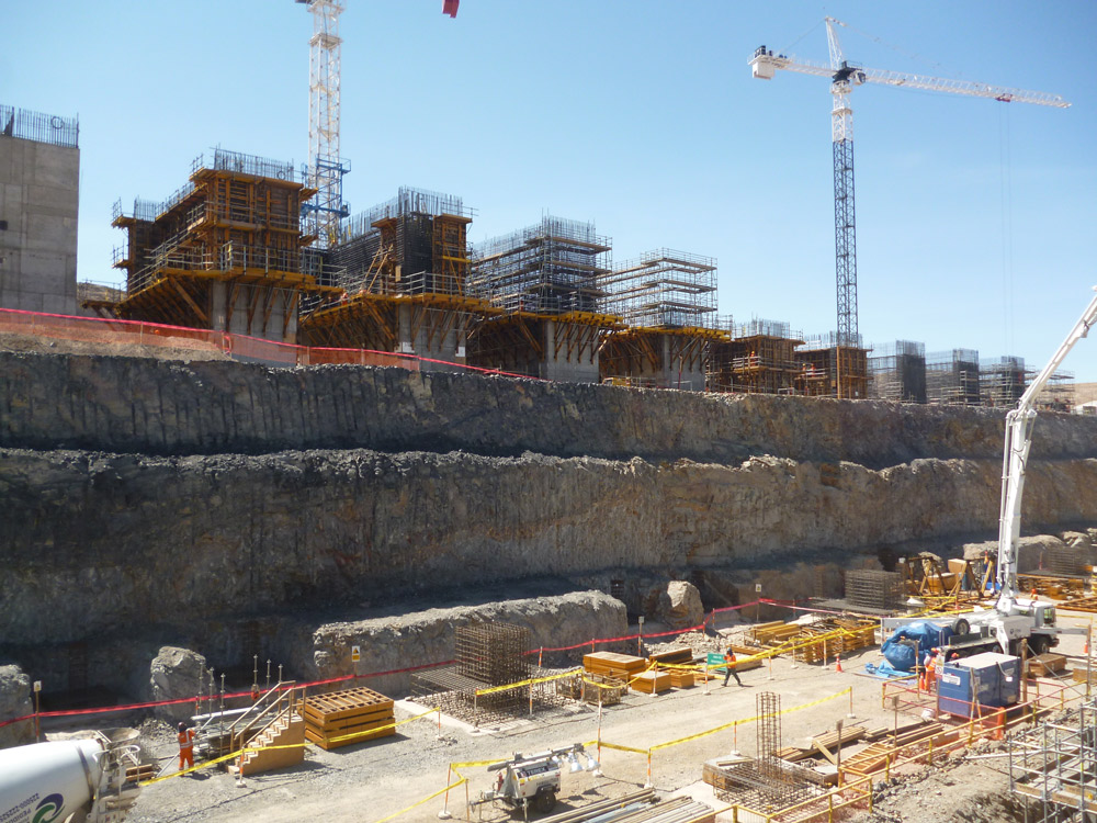 Pour la construction du broyeur (nord et sud), d’une hauteur de 33 m et ayant des murs de 2,10 m à 8,10 m, nous avons eu recours au système ORMA. Pour les dalles de 0,90 m à 2,10 m, le coffrage des poutres a été effectué avec des étais en aluminium ALUPROP.
