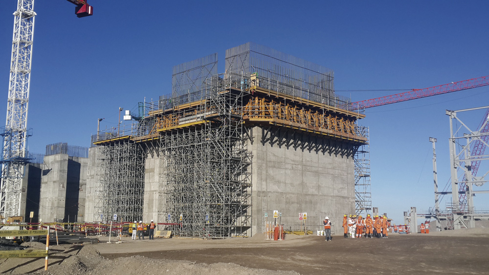 Au cours de la dernière étape, lors de la construction du moulin, des tours T-60 ont été utilisées pour effectuer l’étaiement de la dalle de 2,50 m d’épaisseur et pour répondre aux surcharges horizontales. Ceci a permis d’augmenter de plus d’une tonne la capacité de charge totale. Par ailleurs, la conception mobile de ce système a permis d’avoir un rendement élevé lors du processus de décoffrage. Au total, 127 tours de 1 x 1 m et de 11,25 m de haut ont été utilisées.