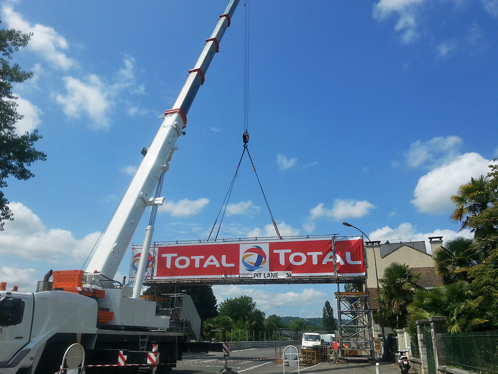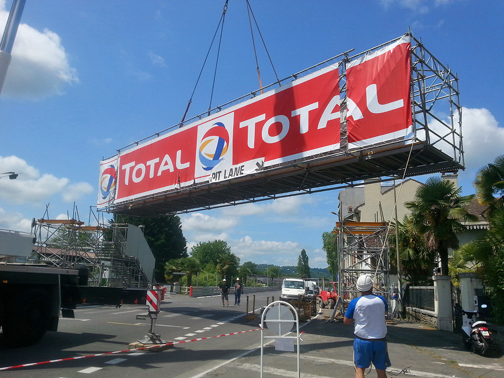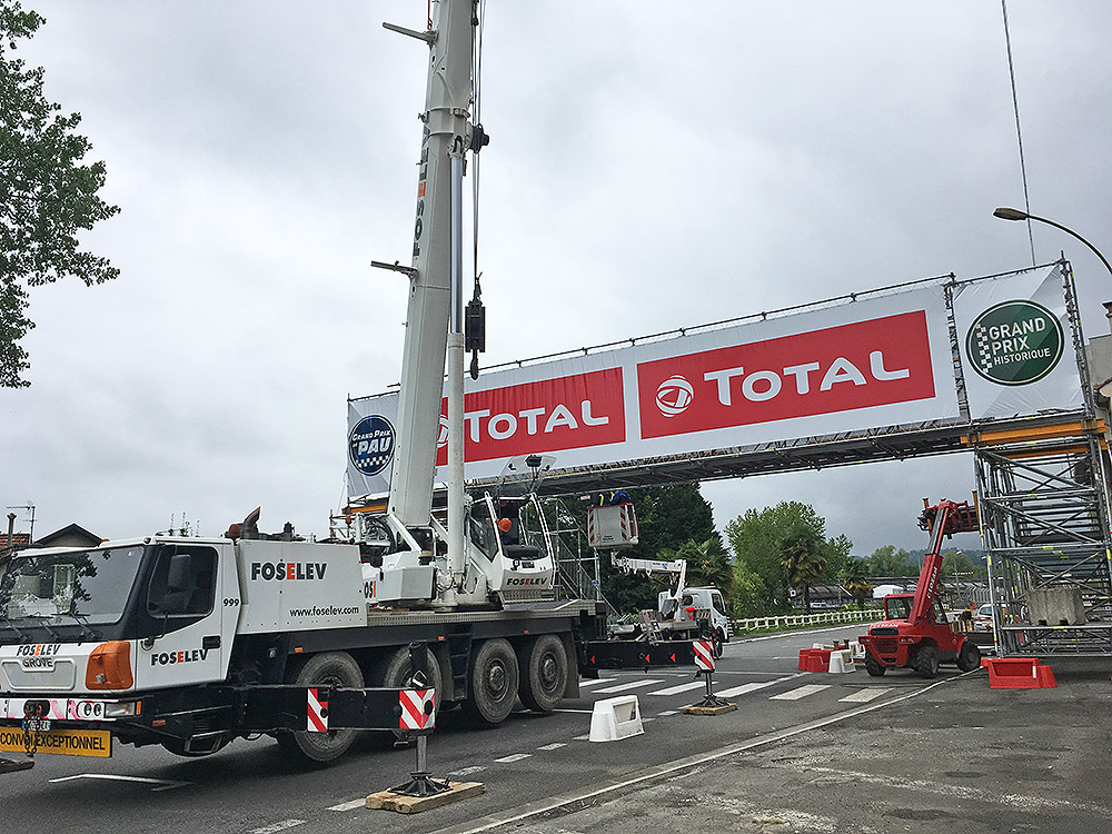 Création d'une passerelle permettant aux spectateurs du Pau Grand Prix d'accéder aux zones Paddock en traversant la piste du circuit. La passerelle est constituée d’échafaudage BRIO, planchers scénique Brio et escaliers BRIO.