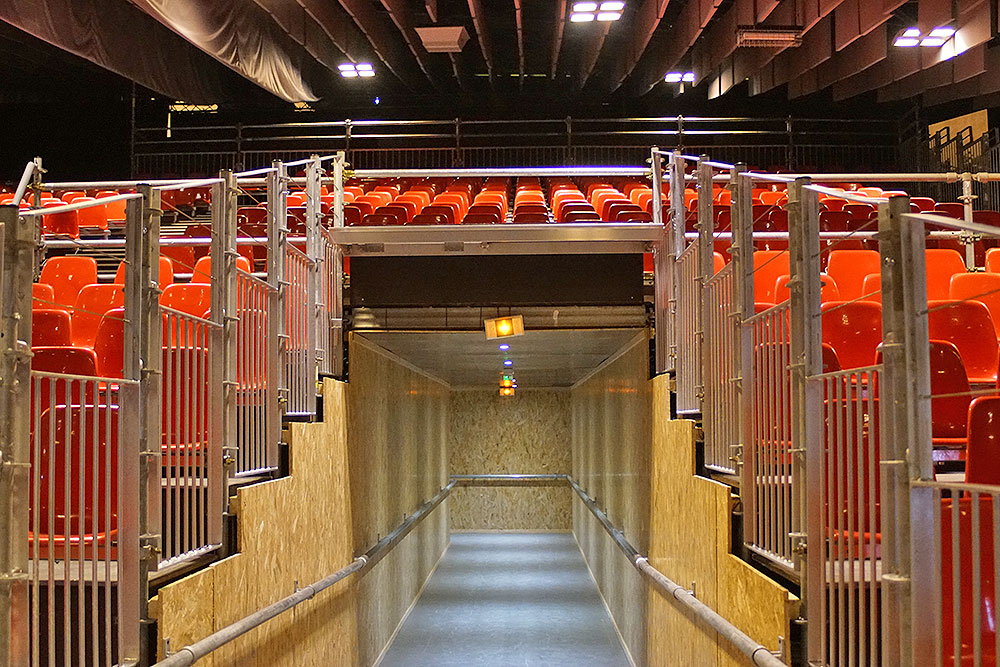 L’assemblage de toutes ces solutions permet de rendre accessible les différents niveaux de la tribune aux PMR en préservant les voies de circulations et d’évacuations de la salle.
