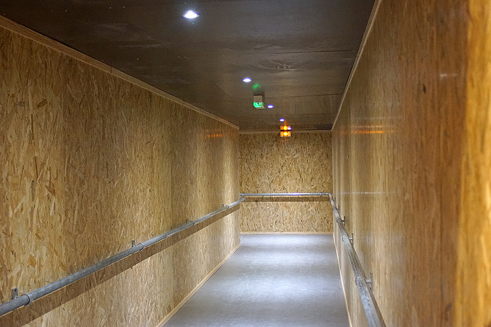Un ensemble de couloir et de vomitoire à été crée sous la tribune pour desservir les sorties existantes.