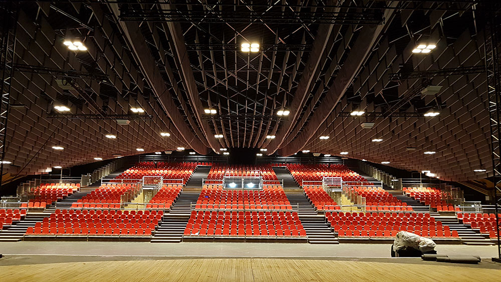 Création d’une tribune pour la comédie musicale « Bernadette de Lourdes » dans la salle Robert Hossein.