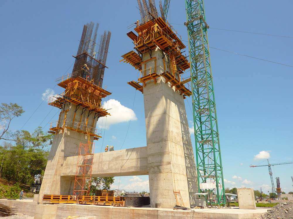 Pour construire les deux piles, les poutres inclinées, les piles intermédiaires et les culées, ULMA a utilisé le système de coffrage horizontal ENKOFORM HMK, le coffrage vertical ENKOFORM VMK et des stabilisateurs et des consoles support de banche.