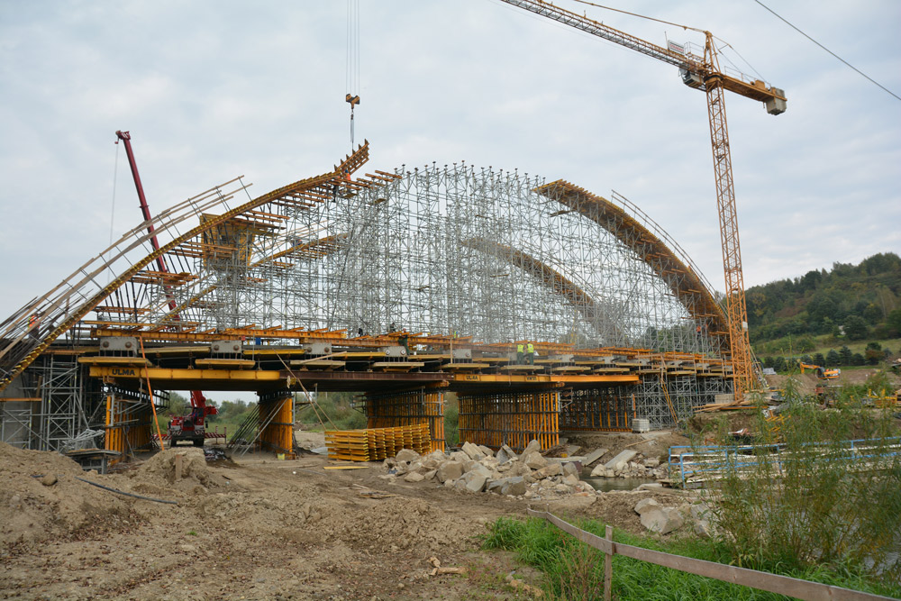 Placées à terre ou sur des profilés métalliques, les tours d’étaiement T-60, utilisés en modules de 1 x 1 m, 1 x 1,5 m et 1,5 x 1,5 m ont parfaitement répondu aux besoins d’étaiement des poutres en arc et des poutres transversales.