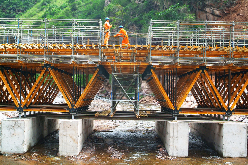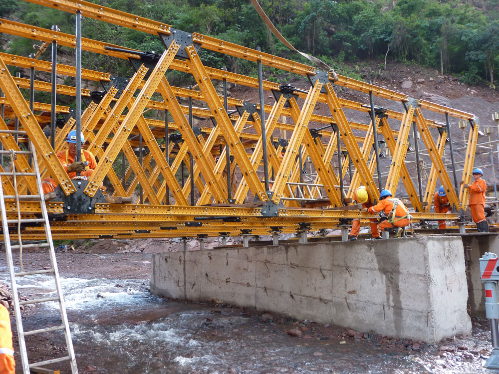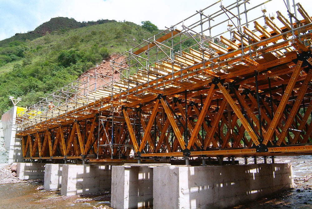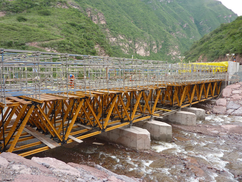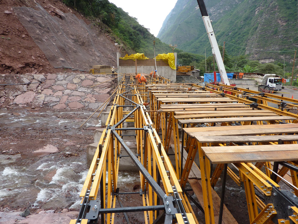 L’exécution des structures a constitué la phase la plus importante. Avec une largeur de 2,6 m et des intervalles de 15 m, elles étaient appuyées sur quatre bases en béton de 0,4 m de large et 2 m de hauteur, positionnées de façon stratégique dans le lit du fleuve.