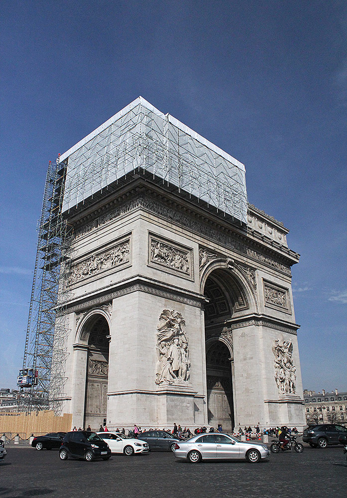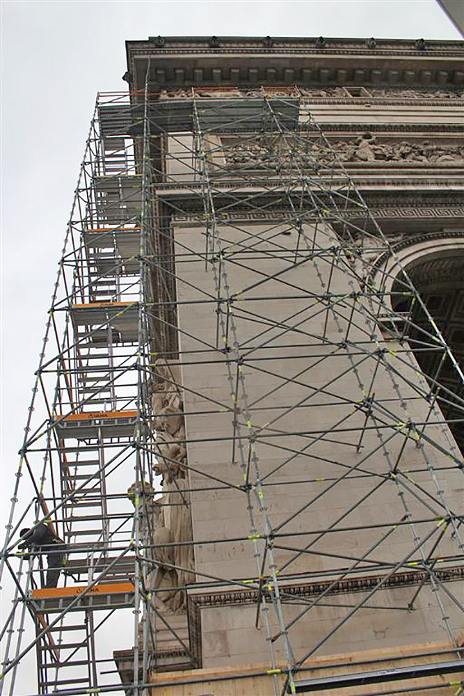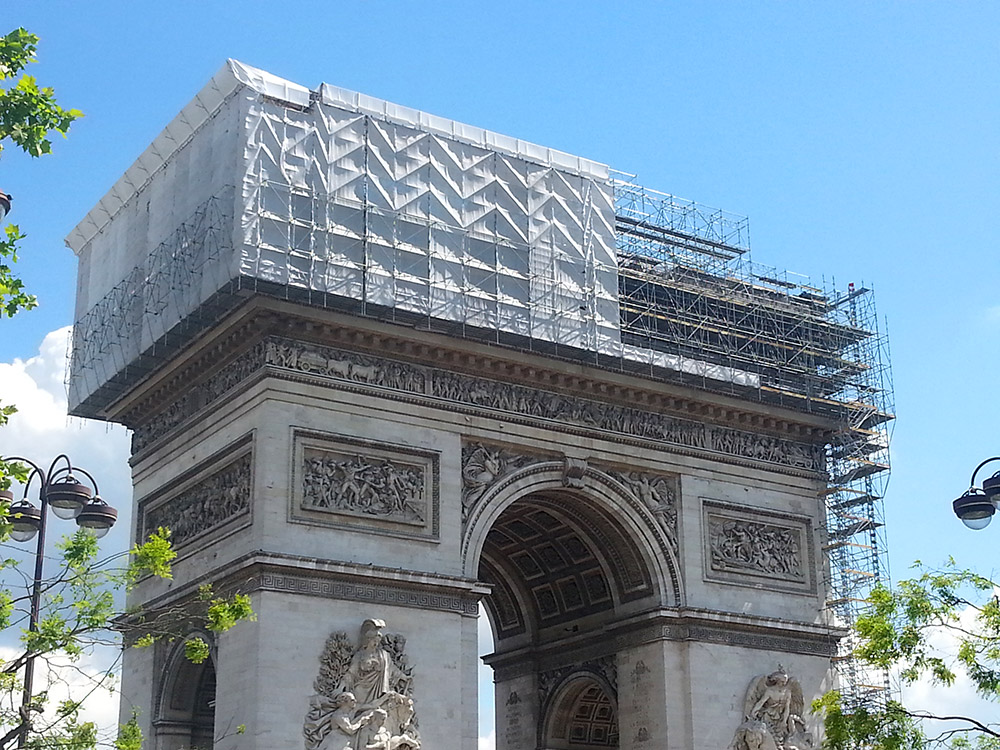 Cet échafaudage a été ancré depuis le dôme central de la terrasse de l’Arc de Triomphe. Afin de garantir une protection totale contre les intempéries, il a été nécessaire d’installer un parapluie en poutres et cadres d’aluminium à plus de 50 m du sol. Cette opération a constitué l’un des plus grands défis techniques de ce projet.