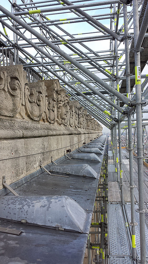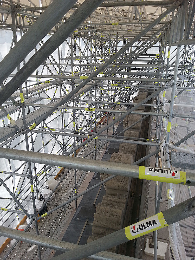 Des plates-formes en porte-à-faux de plus de 4 m capables de supporter de grandes charges ont également été installées. La structure de l’échafaudage BRIO a été fixée au monument à l’aide d’ancrages sur le dôme de la terrasse et sur l’attique.