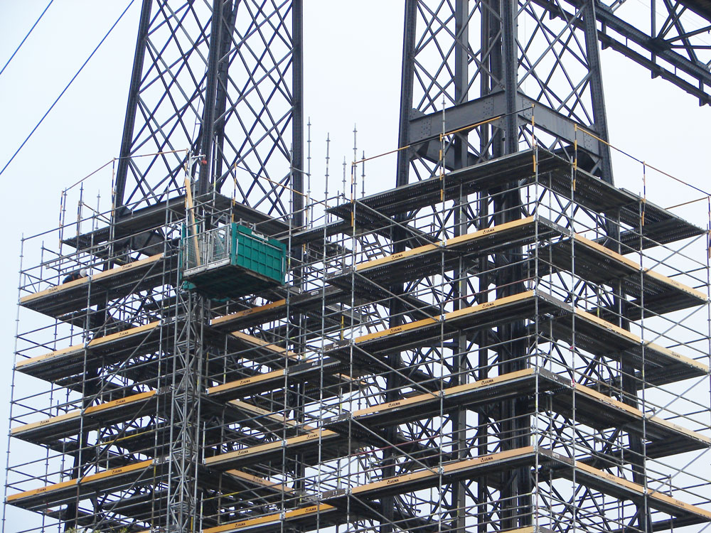 Les échafaudages des tours du pont ont été utilisés pour positionner le plancher d’appui du monte-charge. Ce dernier, muni de plateformes d’échafaudage appuyées sur des passagescamions de 5 m de longueur se situait à 7,5 m de hauteur.