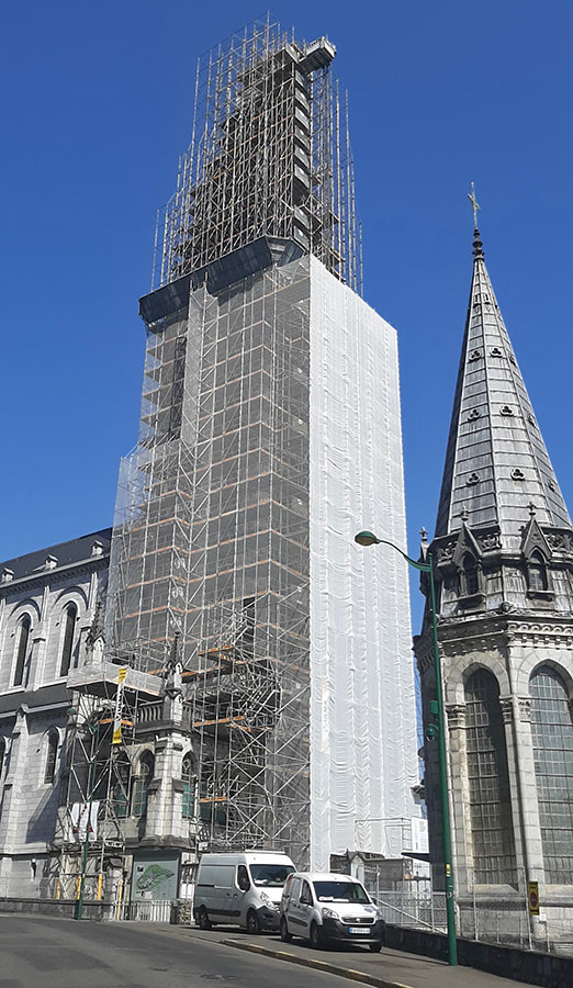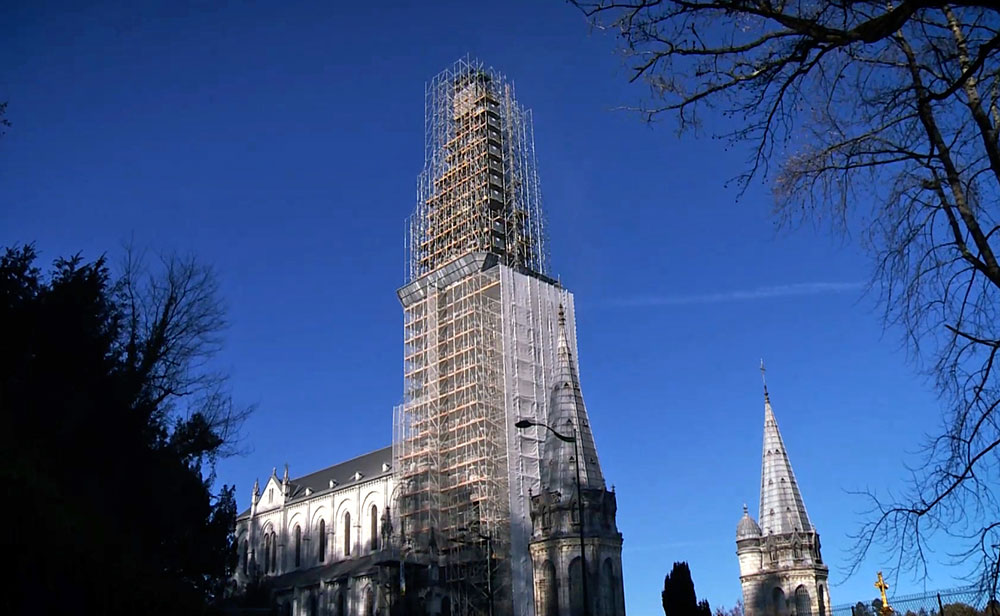 Le clocher se situe à presque 100 mètres au-dessus de la grotte. Aussi, une zone de protection provisoire a été délimitée pour assurer la protection et la sécurité des pèlerins et prévenir tout risque de chute de pierres. Pour compléter la protection du chantier, un filet d’échafaudage a été posé sur les 3 façades secondaires et un filet plus dense, sur la façade côté parvis, permettant la projection de photos ou de vidéos.