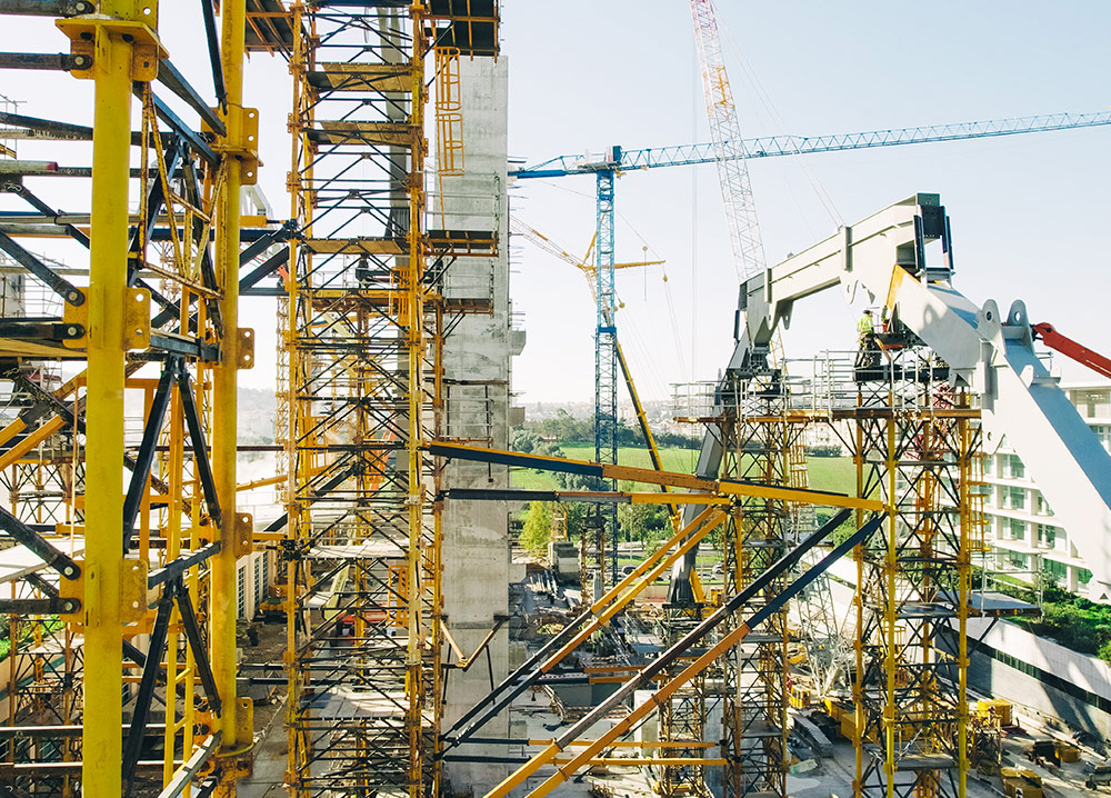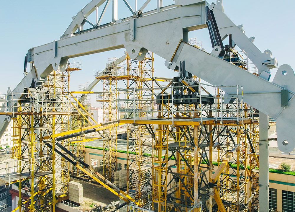 L’installation a nécessité un processus de préparation minutieux. Tout d’abord, des semelles ont été construites pour ancrer les tours d’étaiement et des contrepoids ont été ajoutés pour assurer leur stabilité. Compte tenu de la taille des arceaux, ceux-ci ont été transportés en sections et assemblés directement sur le chantier, soutenus par les tours d’étaiement T-500. La structure a alors littéralement commencé à se développer de haut en bas, le bâtiment étant suspendu aux arceaux principaux.