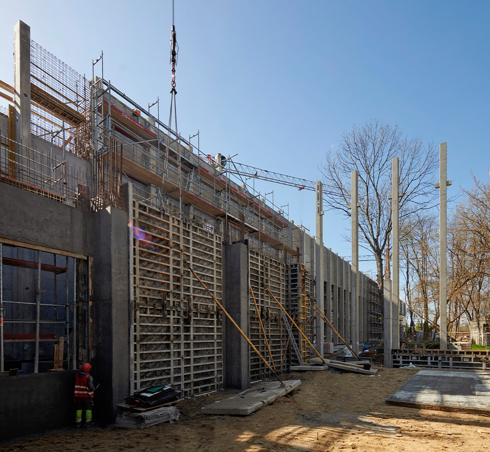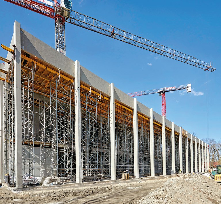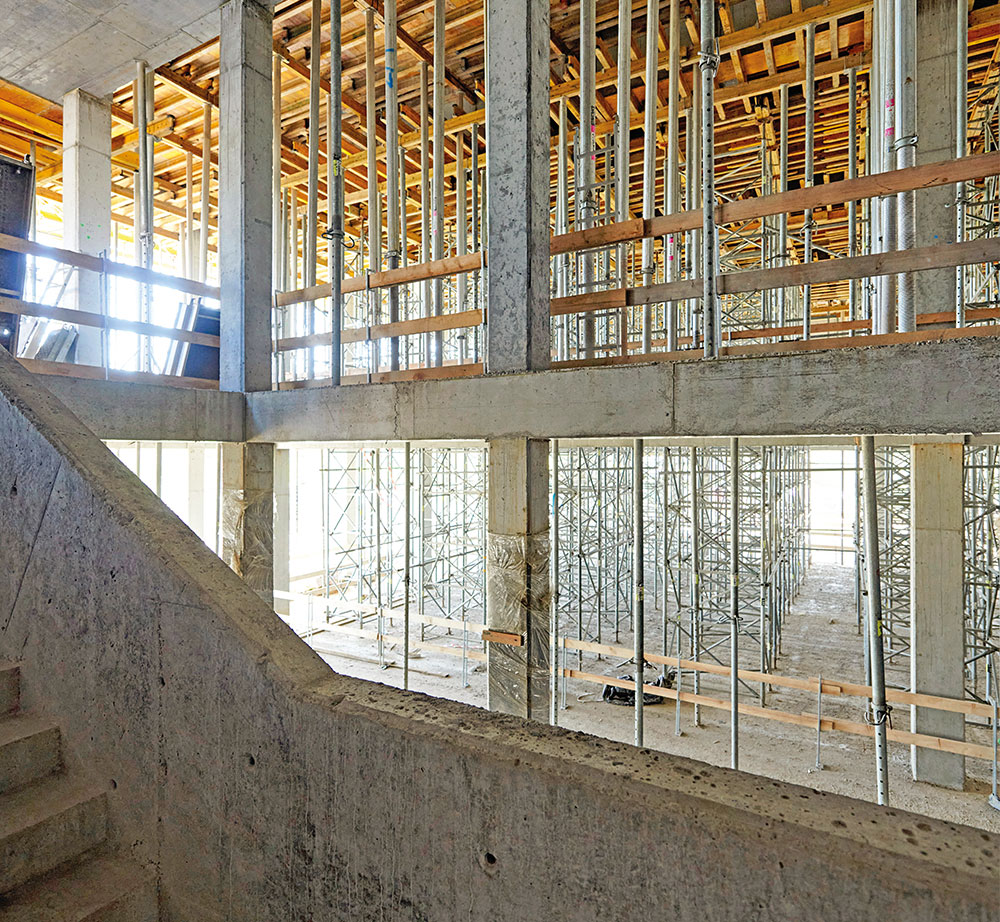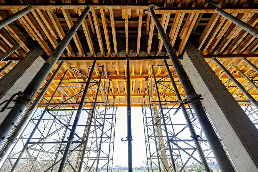 La construction de dalles, au niveau du sol ou en souterrain, exige précision et efficacité. Le système ENKOFLEX avec sa conception de poutres a été retenu. En fonction de la hauteur requise, les dalles ont été supportées par des étais EP, ALUPROP ou T-60, pouvant atteindre jusqu’à 11,2 m. Pour garantir la sécurité et faciliter l’accès, les opérateurs ont utilisé un échafaudage BRIO lors des travaux de pose d’armatures et des opérations de manutention des coffrages.