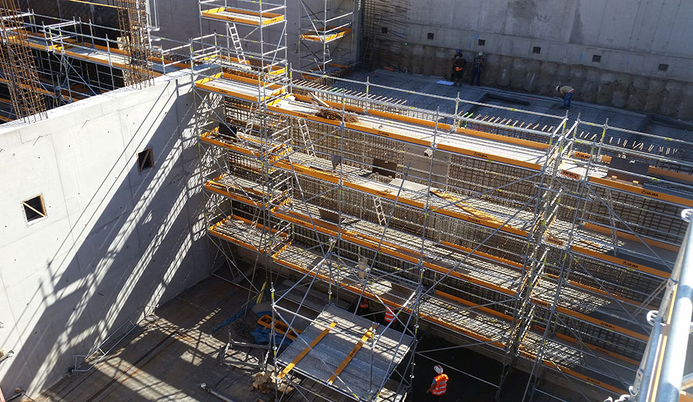 Les dimensions du projet et la diversité des actions ont nécessité des solutions spécifiques pour chacun des secteurs en cours d’exécution. La circulation de l’eau de façon continue et les technologies utilisées dans ces usines demandent une exécution précise en matière de géométrie et finitions. Avec l’aide du système MK, aussi bien lors de son application en vertical ENKOFORM VMK que horizontale ENKOFORM HMK, plus de 30 constructions spéciales ont été créées. De plus, les murs de plus de 12 m ont été bétonnés en une seule fois avec un coffrage modulaire ORMA renforcé par filières MK.