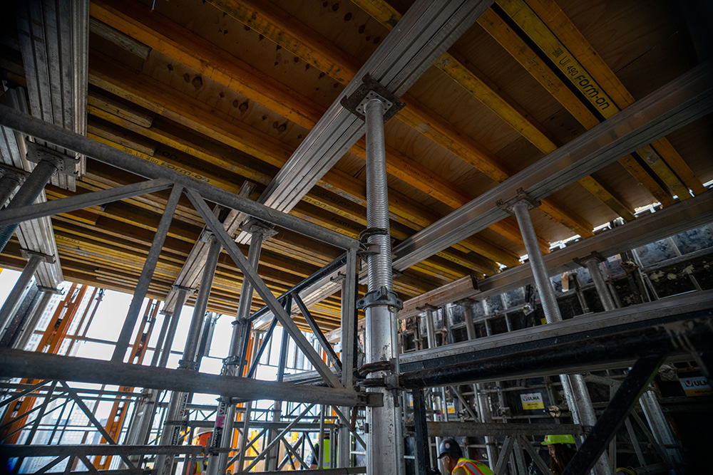 Le système CC-4 a été utilisé comme coffrage de dalles jusqu’à 7,3 m de hauteur. Associée aux étais résistants ALUPROP, sa conception légère et sûre a permis une installation rapide et efficace. Non seulement la productivité a augmenté, mais la finition du béton a également été de qualité supérieure.