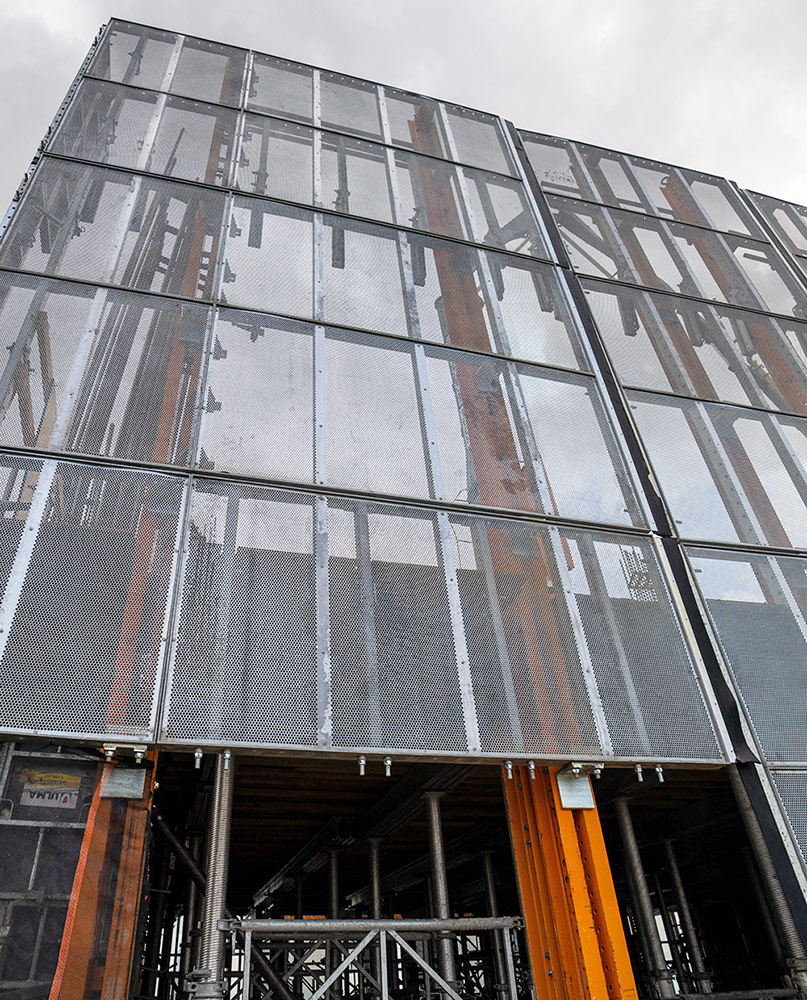 Pour protéger le périmètre du vent et de la hauteur, la solution technique a été apportée par le système HWS. Avec l’installation d’un ensemble d’écrans, ce système couvre le périmètre du bâtiment, tout en optimisant les délais et les processus. De plus, il a permis de lever deux écrans simultanément grâce à son puissant mécanisme hydraulique.