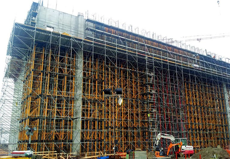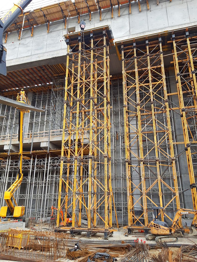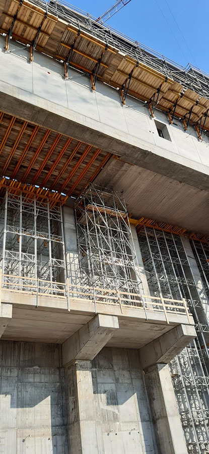 Les tours en aluminium ALUPROP, configurées pour atteindre une hauteur de 21 m, ont été utilisées dans les différents étages et subdivisions internes de l’ouvrage afin de soutenir le bétonnage des dalles d’un mètre d'épaisseur.