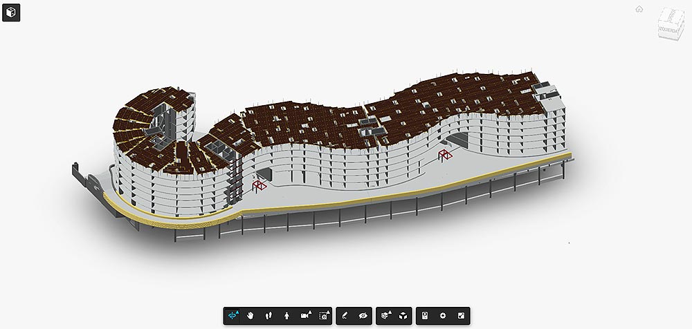 La phase 3A, qui implique les architectes de premier plan Gehry Partners et Foster + Partners, constitue une étape cruciale. Elle comprend plus de 550 appartements, un hôtel et une rue commerçante piétonne. L’équipe ULMA Adapt Formwork participe à la troisième phase du projet en fournissant des coffrages pour le bâtiment le plus emblématique du complexe. En effet, il s'agit de l'édifice le plus long d’Europe, présentant une forme sinueuse évoquant celle d’un serpent. Le coffrage de dalles en aluminium CC-4 a permis de répondre aux principales exigences du projet : la finition du béton apparent, les géométries circulaires et en forme de crochet, ainsi que la diversité géométrique des dalles. L’équipe d’ingénieurs a conçu un panneau triangulaire qui lui a permis de s’adapter aux différentes géométries des dalles.