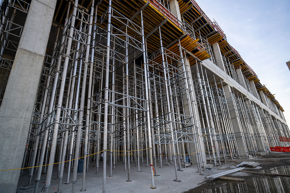 Notre intervention a commencé sur le parking à quatre niveaux, où le système de coffrage de poutres ENKOFLEX et l’étaiement MEGAFRAME ont été utilisés pour réaliser les dalles et les poutres avec des épaisseurs allant de 40 à 90 cm. Ces systèmes se distinguent par leur flexibilité et leur capacité à s’adapter à différentes géométries et charges, ainsi que par leur rapidité de montage et de démontage, ce qui réduit considérablement les temps de réalisation sur le chantier.