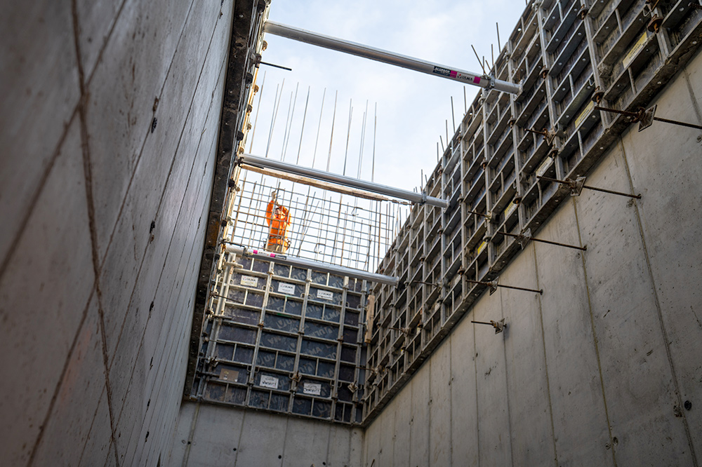 Le coffrage modulaire MEGALITE, en unités impériales, pour des hauteurs allant jusqu’à 4,8 mètres, a été utilisé pour l’exécution des noyaux, des murs de cisaillement et des colonnes. Ce système offre une solution légère, robuste et facile à utiliser, idéale pour les projets aux délais courts et aux exigences techniques élevées. De plus, il permet d’obtenir un béton avec une finition de haute qualité et de mettre en place un cycle de travail rapide et efficace.