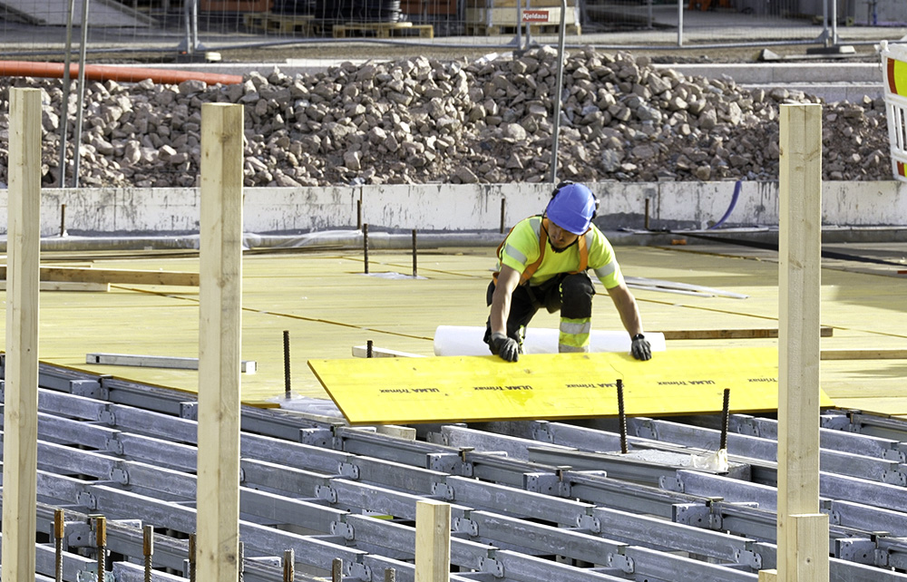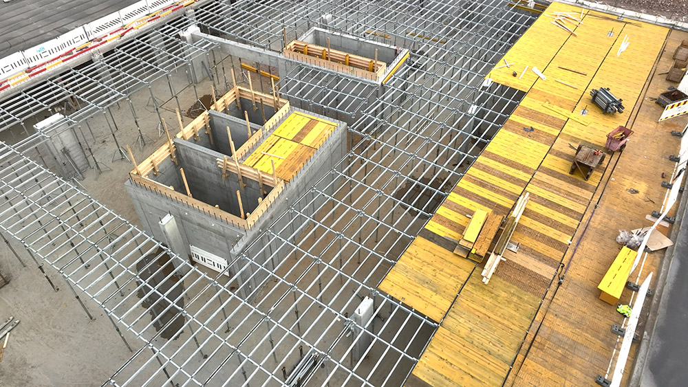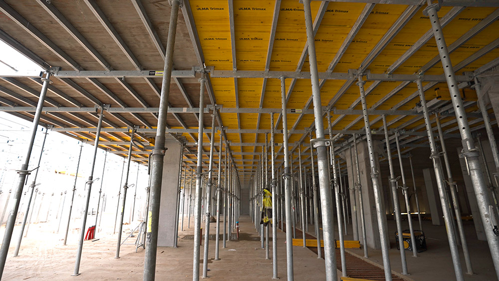 Pour la réalisation de la dalle précontrainte par post-tension, d’une épaisseur de 35 cm, il a été choisi de diviser les travaux en phases d’environ 1 000 m². Sur ces surfaces, ULMA a fourni un coffrage réutilisable ONADEK, associé à des étais EP et des poutres en bois pour les fixations. Le choix d’ONADEK a permis de répondre efficacement aux exigences de géométrie, de flexibilité et de charge propres à ce type de dalles. Sa conception modulaire, associée à sa facilité d’assemblage et de décoffrage, a contribué à maintenir des performances élevées sur le chantier.