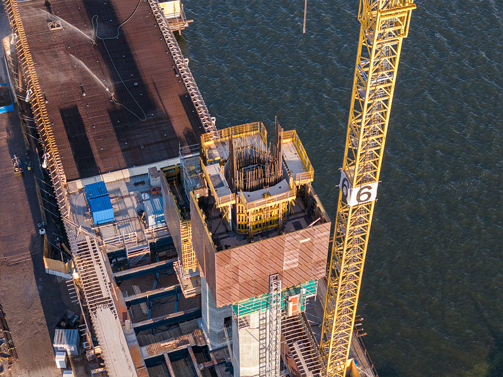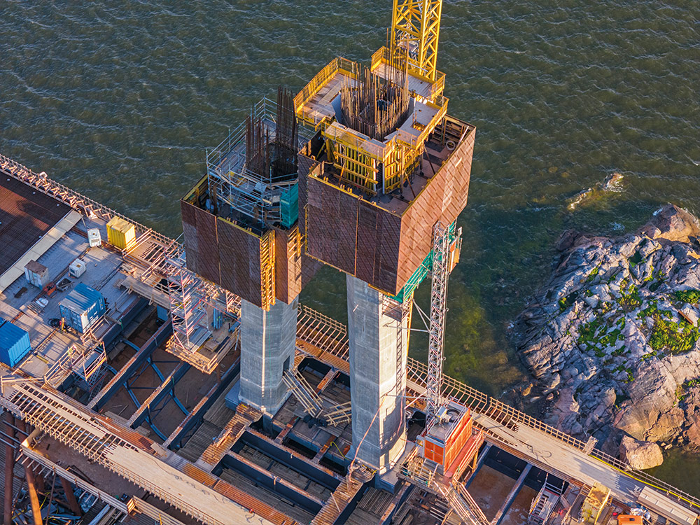 La section initiale en forme de « V » a été réalisée à l’aide d’un coffrage capable de s’adapter à de multiples géométries, ENKOFORM HMK, étayé sur un système d’étaiement T-60. Suivant la construction du pylône, le coffrage a été adapté aux sections changeantes jusqu’à atteindre 31 m. Au cours de la deuxième phase, la structure en forme de « A » a été réalisée en combinant les systèmes autogrimpants ATR et KSP avec le coffrage HMK et des plateformes de travail qui ont assuré l’efficacité et la sécurité de la construction.