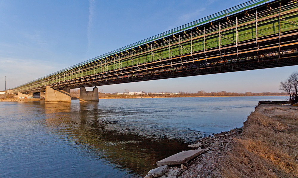 SOLUTION L’échafaudage BRIO a été installé en porte-à-faux et suspendu au tablier et aux arcs pour créer des planchers sans entraver la circulation. Des structures d’échafaudage ont été installées depuis le sol sur les piles et les culées pour permettre l’accès des travailleurs à tous les fronts du chantier. Pour assurer la sécurité sous le pont, deux portiques de protection des voies ont été montés avec des tours d’étaiement, des éléments d’échafaudage BRIO et des coffrages de poutres ENKOFORM.