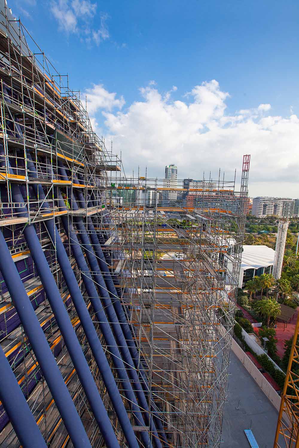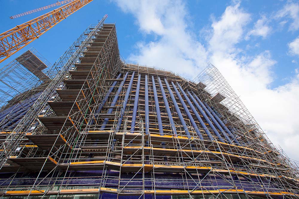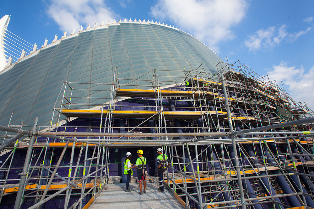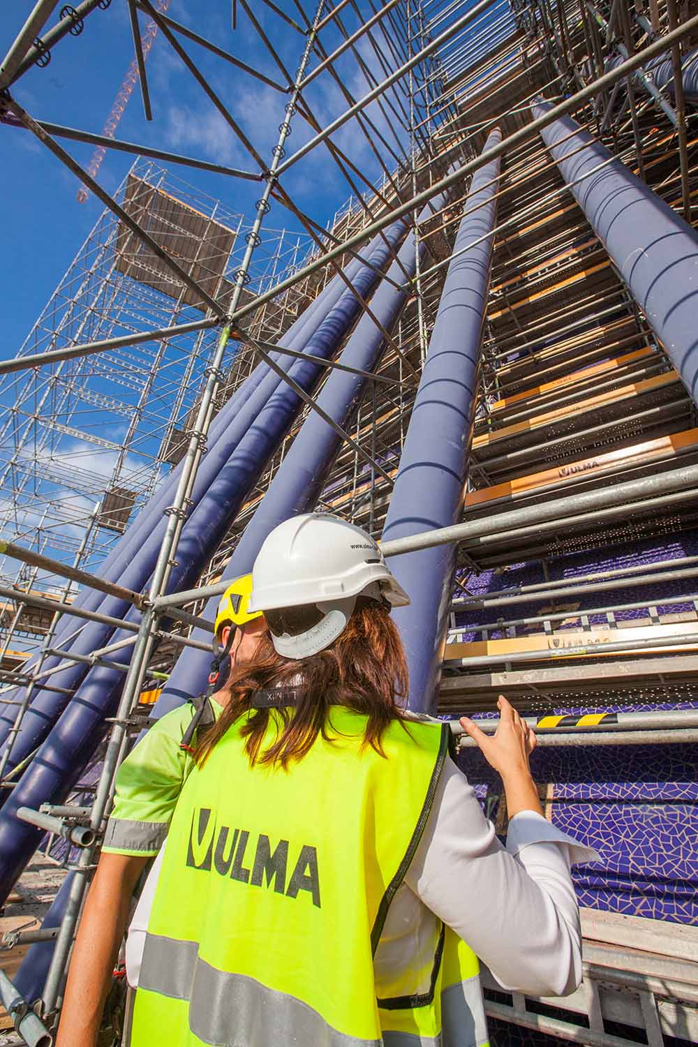 Les solutions d’échafaudage de ce projet ont été entièrement apportées par ULMA. Les travaux de réhabilitation ont consisté à couvrir le bâtiment au moyen du système d’échafaudage multidirectionnel BRIO sur une superficie de plus de 4 247 m2. L’architecture du bâtiment de forme elliptique et les changements de pente à différentes hauteurs ont constitué un véritable défi pour la conception du projet.