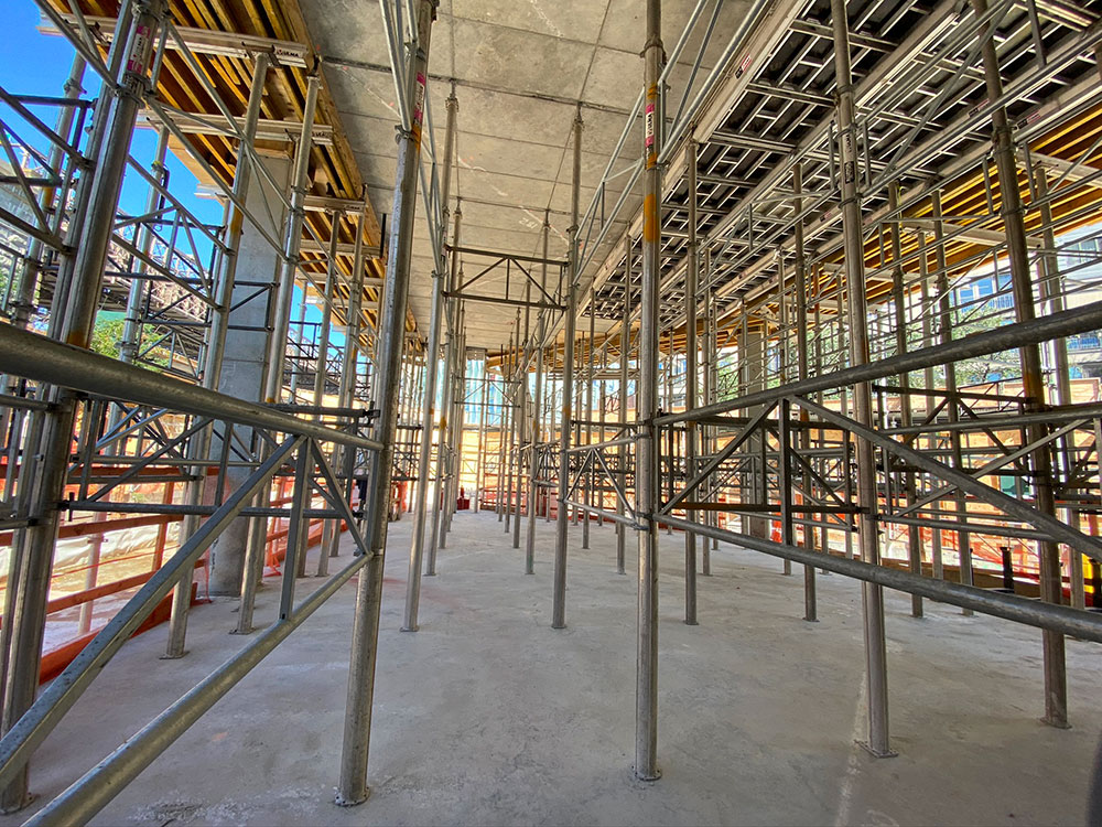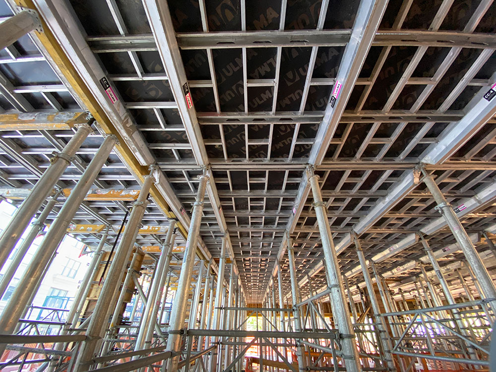 Les coffrages de dalles CC-4 et ENKOFLEX ont été associés à des étais ALUPROP faciles à ajuster en hauteur. En outre, des cadres de contreventement ont été utilisés pour monter des tours d’étaiement afin d’augmenter la capacité de charge.