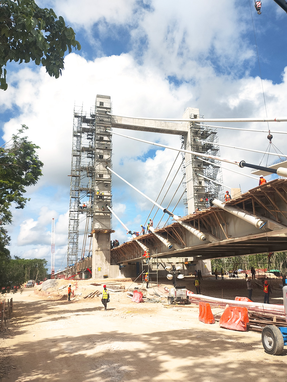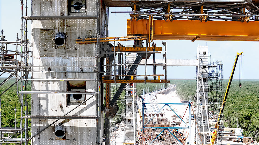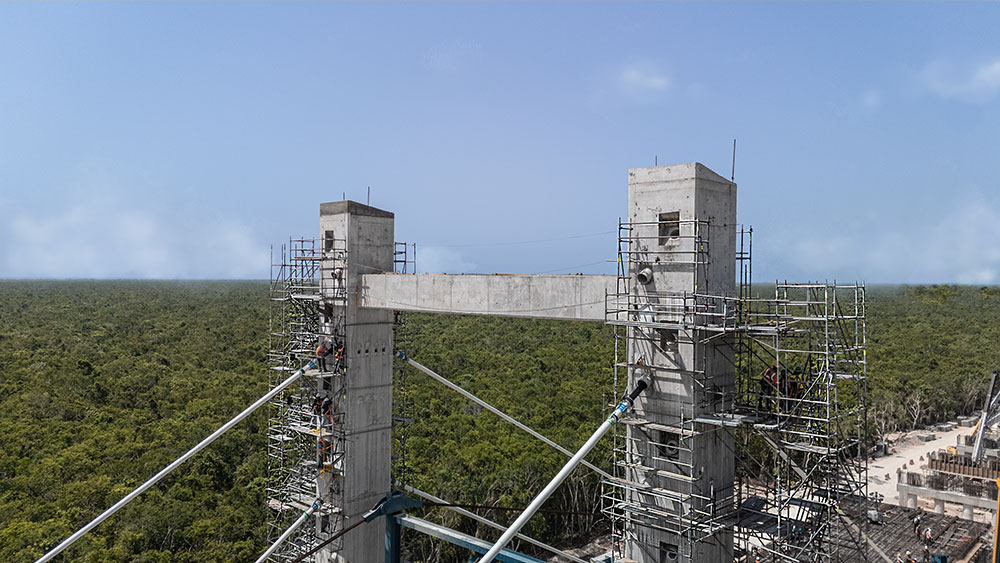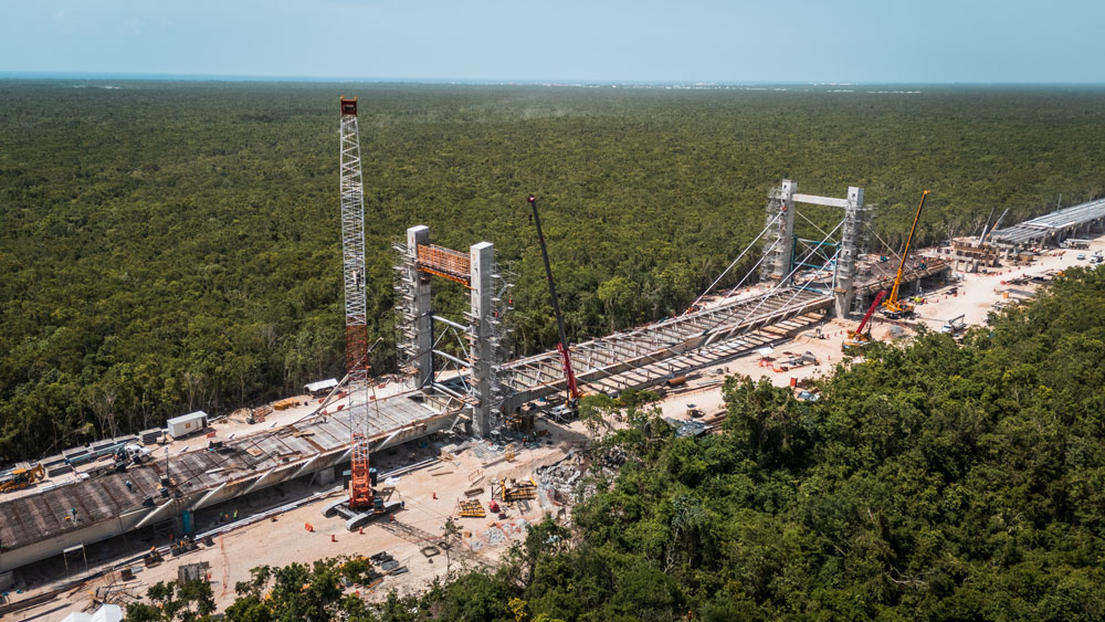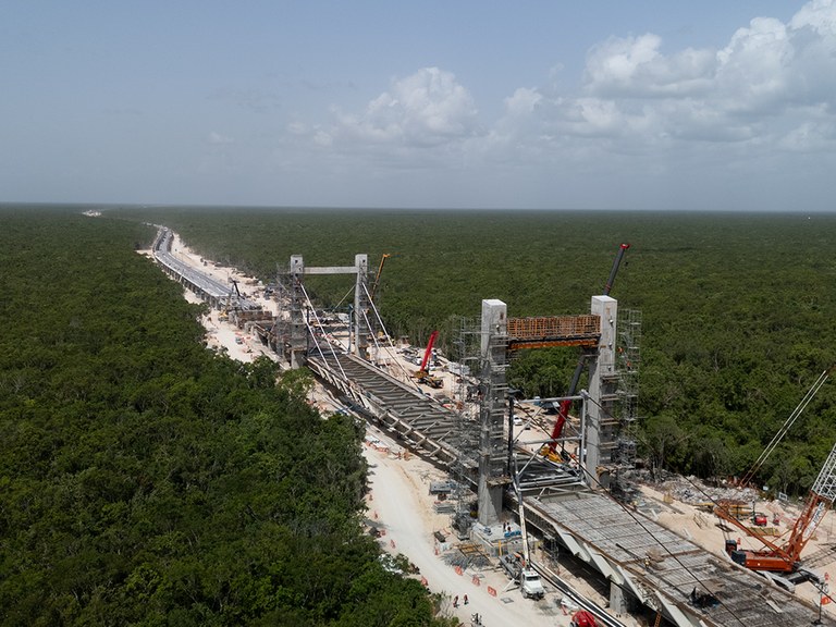 Sur le tronçon V, les travaux présentaient des défis techniques importants en raison de la présence d’un sol karstique. Pour surmonter ces conditions géologiques, 42,1 km de voies surélevées et 25,6 km de remblais ont été conçus. L’un des éléments les plus remarquables du tronçon est un pont haubané de 266 m, conçu pour préserver la grotte Garra del Jaguar à Tulum. Cette structure repose sur deux axes principaux, constitués chacun d’une paire de pylônes de 33,40 m de haut, reliés par une poutre de liaison de 17,50 m. Cette configuration structurelle a assuré la stabilité du pont et permis de protéger l’environnement naturel sans interférence.