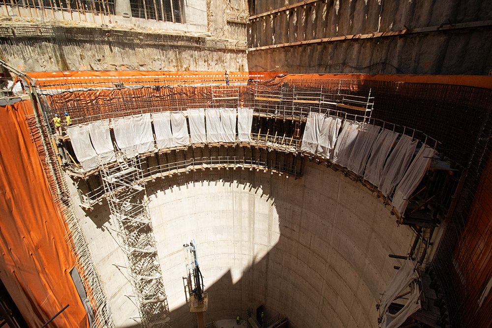 Étant donné qu’il n’y a pas d’espace pour installer des escaliers mécaniques, l’accès à la station se fera par des ascenseurs qui descendront à 60 m. Pendant les travaux, le puits est devenu la voie d’accès tant pour les ouvriers que pour les équipements, y compris les bétonnières.