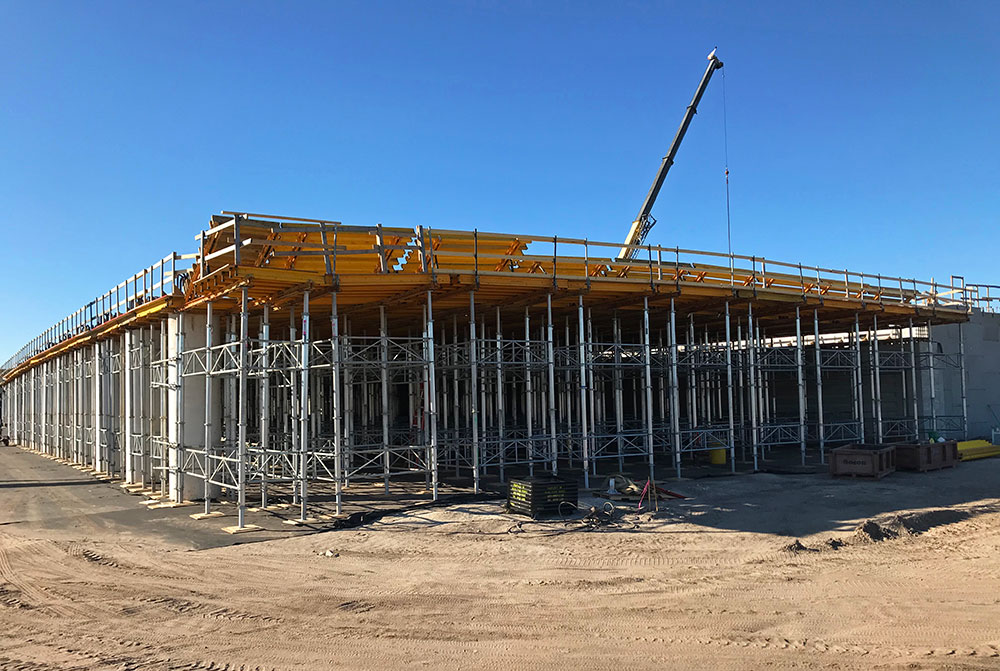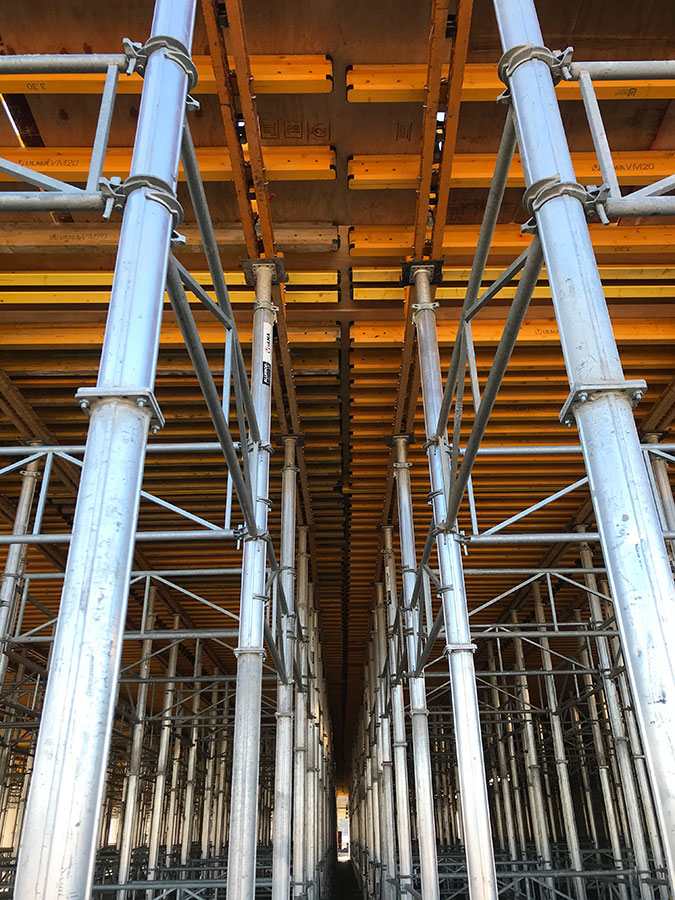 Pour répondre aux besoins de structures circulaires, ULMA a fourni des coffrages métalliques circulaires. Pour la dalle, ULMA a utilisé un total de 4 360 m² de Tables VR avec des entretoises MK et des étais en aluminium ALUPROP qui présentent une capacité de charge élevée, une grande durabilité et un montage aisé en raison de la facilité et de la rapidité du réglage en hauteur.