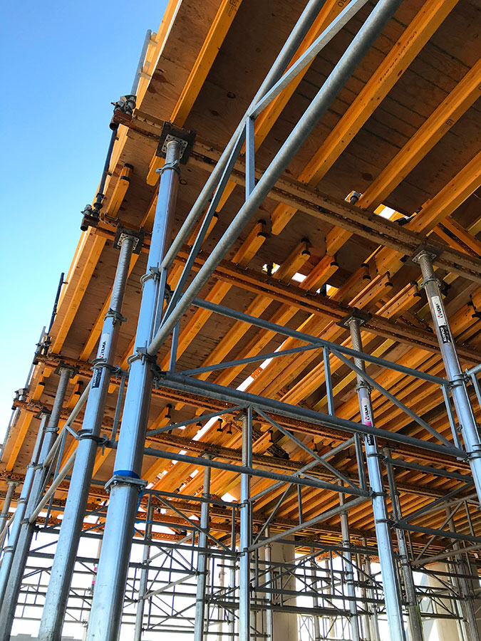 Les tables VR et les solutions ALUPROP ont été préassemblées dans les entrepôts d’ULMA, ce qui a réduit les temps de montage sur site et permis d’augmenter la productivité. Les tours ALUPROP préassemblées ont été transportées directement jusqu’aux travées. Le montage a été essentiellement réalisé au sol, ce qui a simplifié les opérations et assuré une plus grande efficacité.