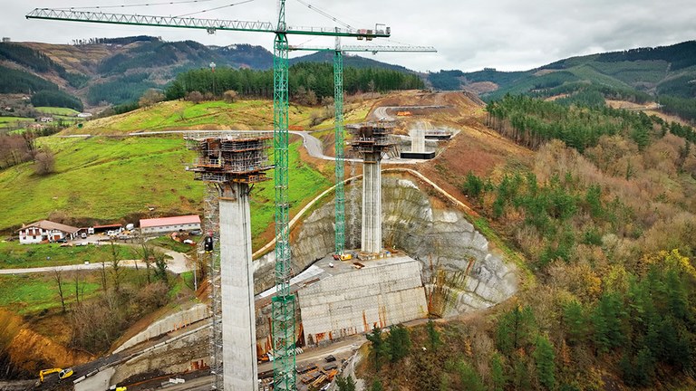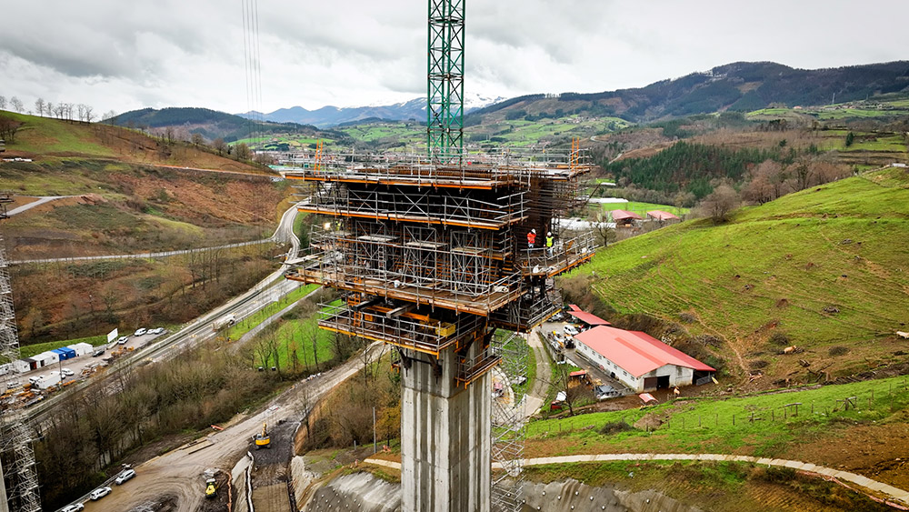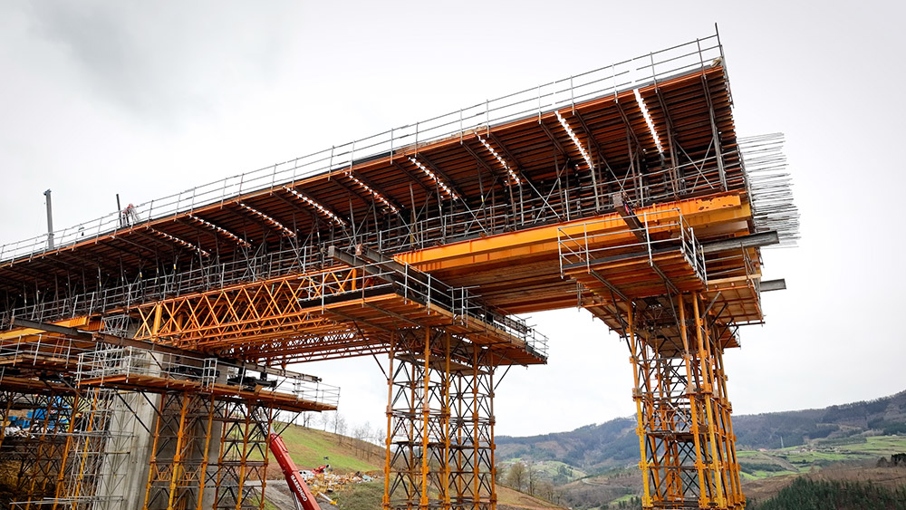 Le tablier se compose de deux zones dotées d’un bord continu, associées aux culées, et d’une partie centrale avec un bord variable qui ont conditionné le choix de la méthode de construction dans les deux cas. L’étaiement en portique a été utilisé dans les zones des culées en associant un cintre T-500 et un étaiement OC, 6 ensembles de fermes J-33 de 17,7 m de long et un coffrage ENKOFORM H-120, avec des pans de différentes dimensions et inclinaisons qui reproduisent la section du tablier.
