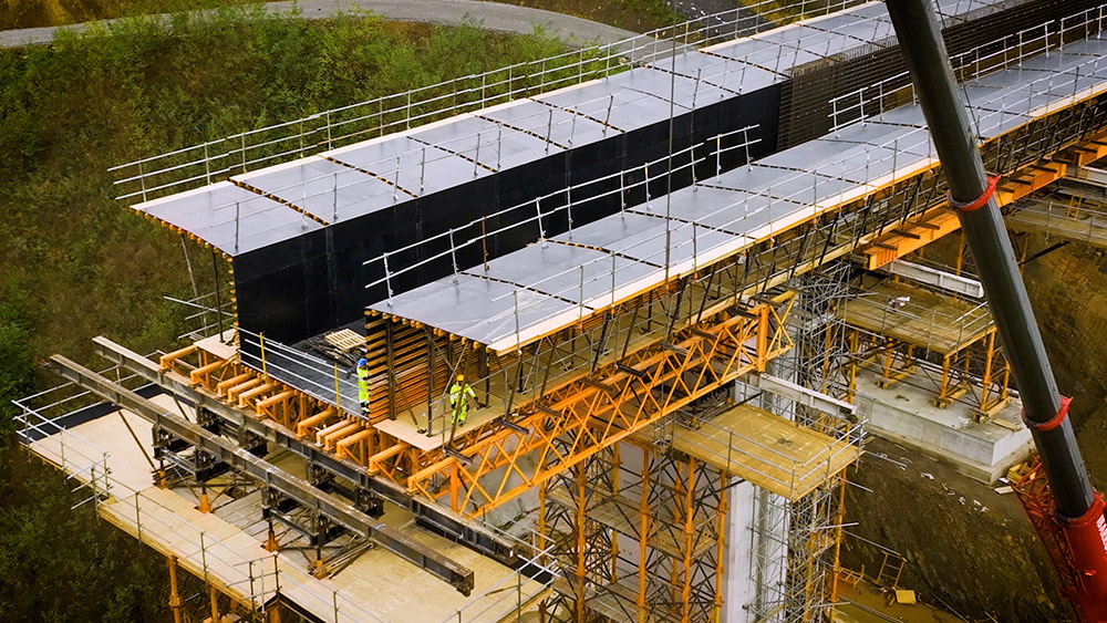 Les 6 piles qui composent le viaduc atteignent une hauteur maximale de 71 m. D’où l’importance de la sécurité et du rendement dans le choix des équipements. Le système autogrimpant ATR et les pans de coffrage ENKOFORM V-100 formaient un ensemble entièrement fermé, qui a été surélevé à l’aide d’un système hydraulique de façon autonome sans avoir à utiliser la grue, en s’adaptant au changement de géométrie à chaque coulée. Les deux ensembles de coffrage intérieur ont été posés sur des plateformes télescopiques KSP afin d’absorber les variations de la géométrie de la pile.